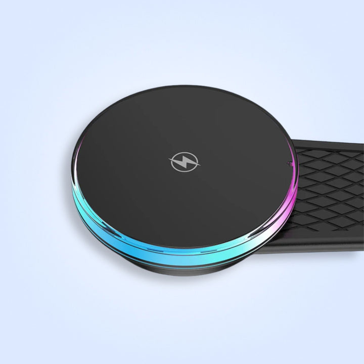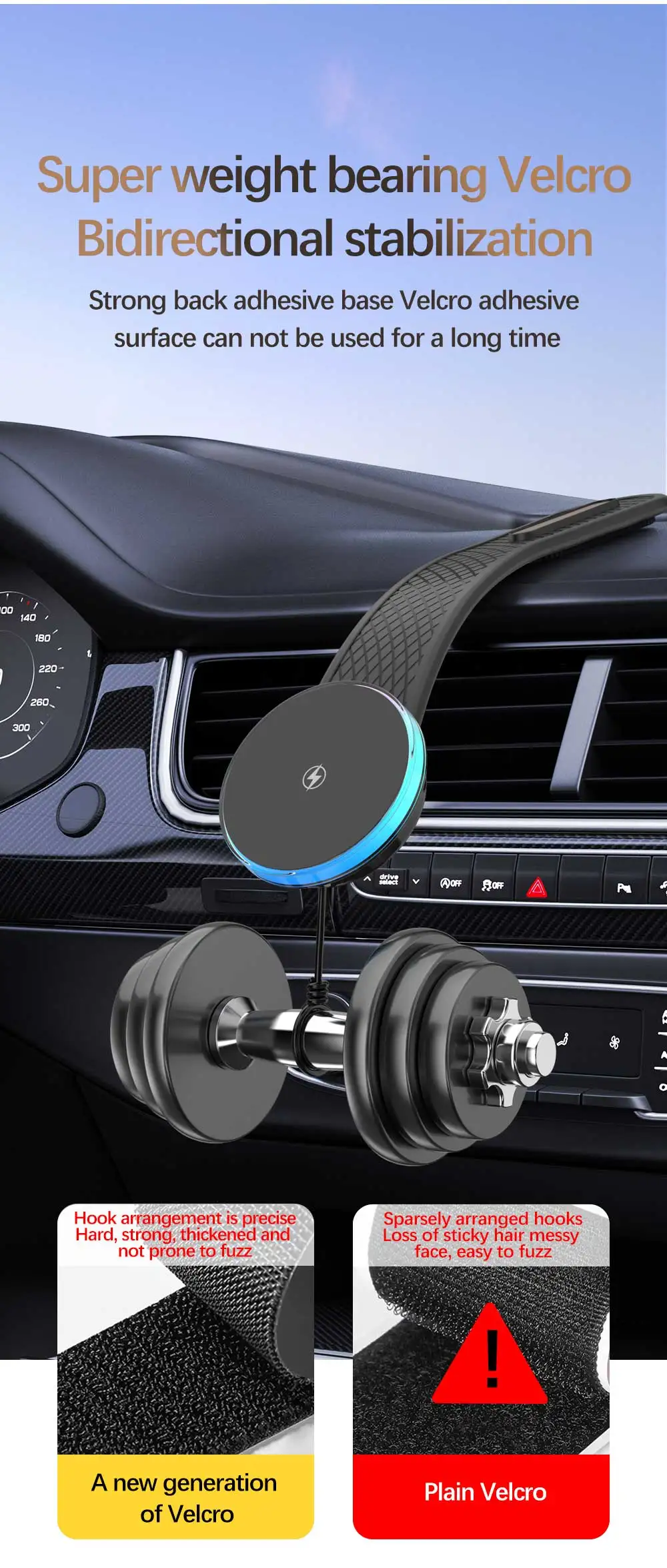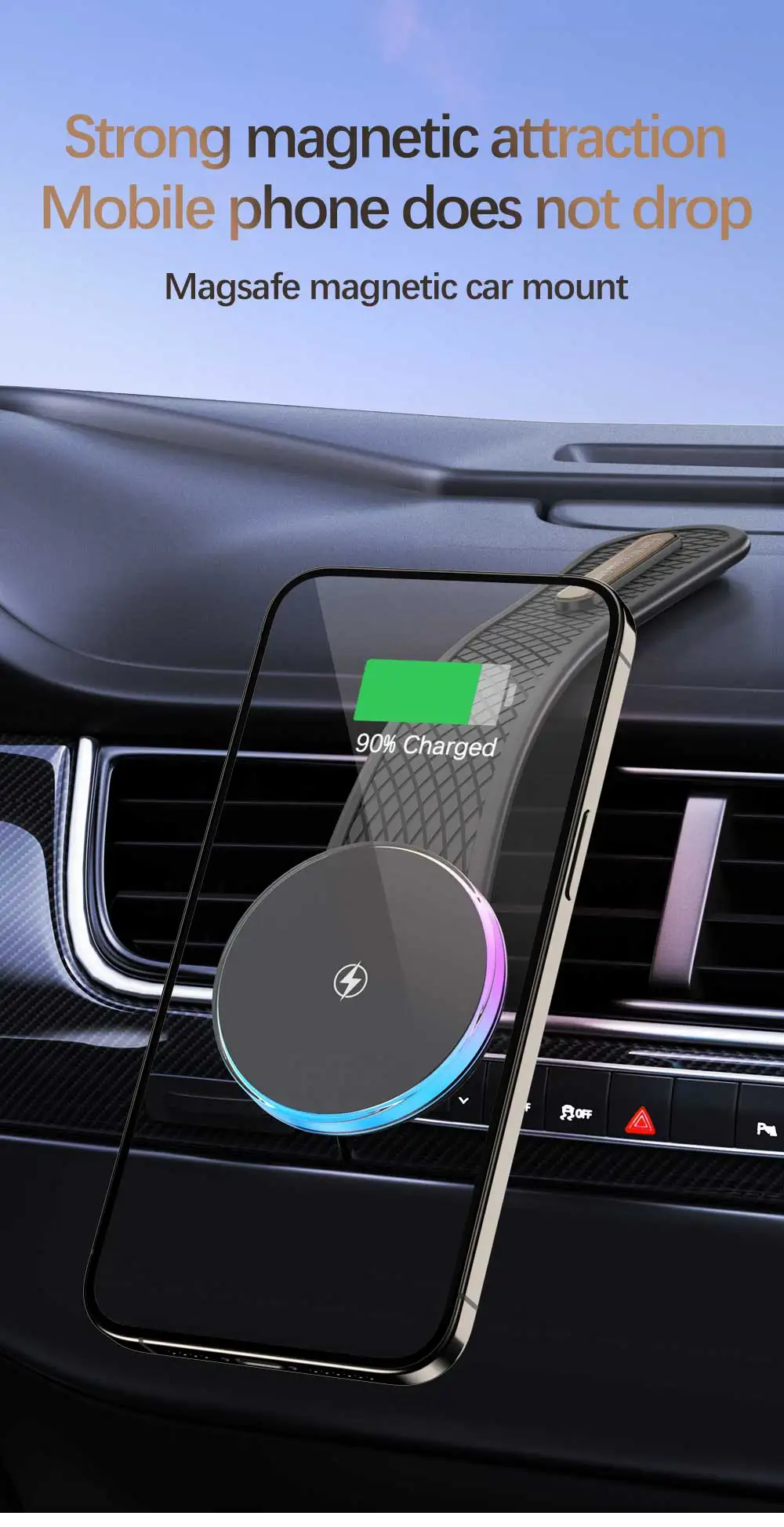 Power up and secure your phone in one snap. This 15W MagSafe-compatible magnetic wireless car charger locks onto your device for fast, stable charging while you drive. The foldable, memory-alloy arm and 360-degree joint let you position your screen perfectly in portrait or landscape. A surround ambient ring light adds a modern glow without glare.