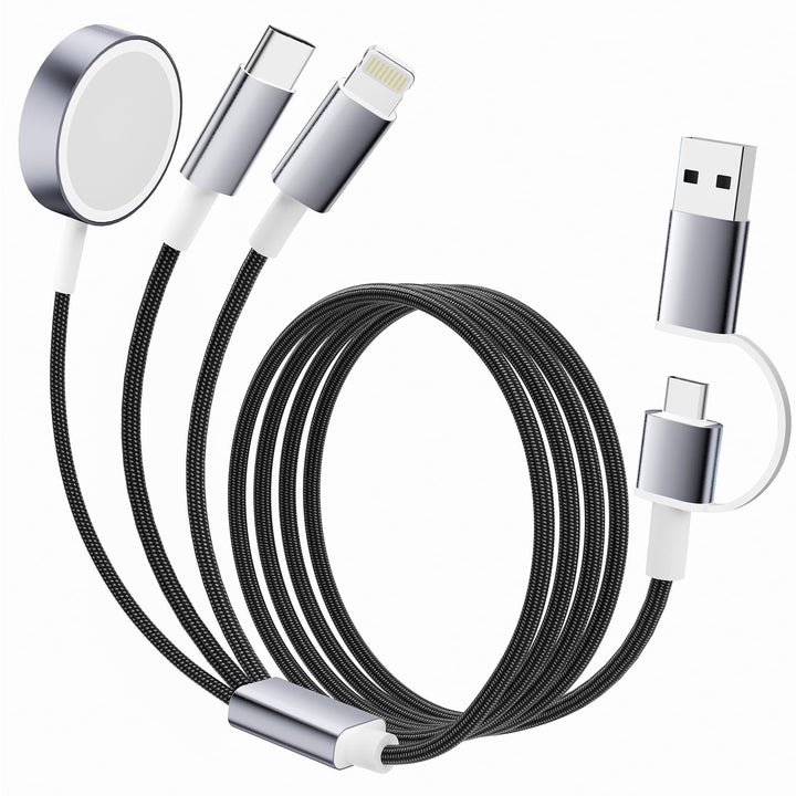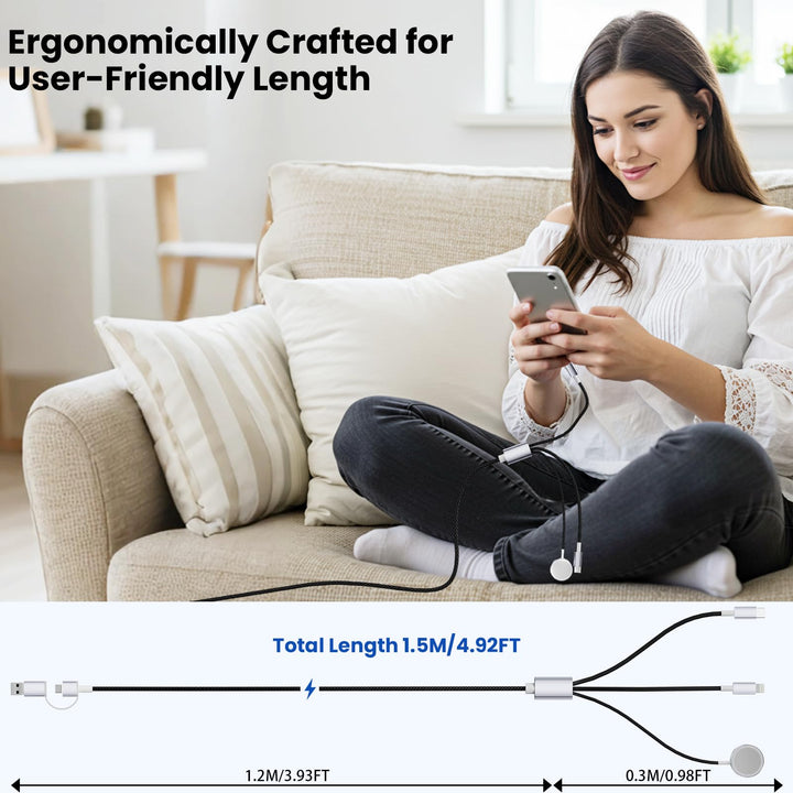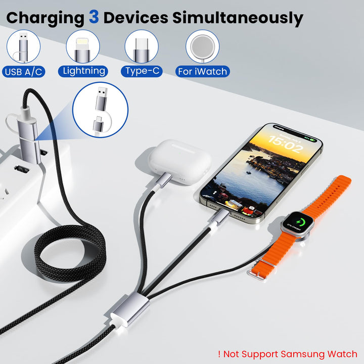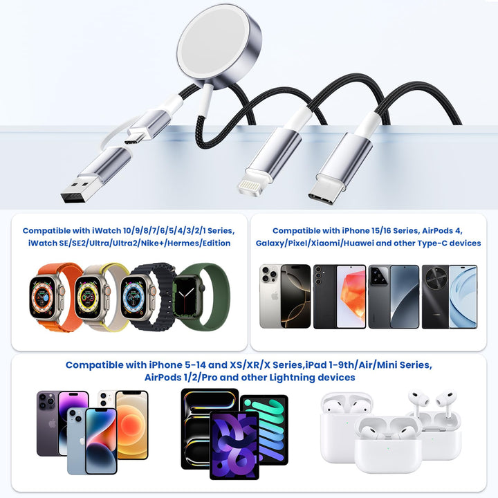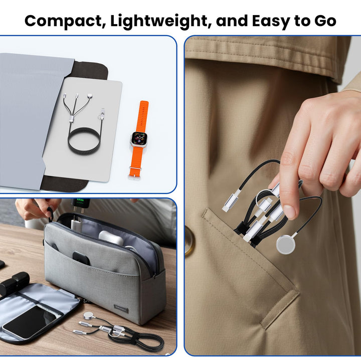 Meet your go-anywhere 3-in-1 Apple Watch charger cable—purpose-built for travel, the car, and everyday carry. This smart lead combines a magnetic Apple Watch puck with Lightning and USB-C tips, so you can power your Watch, iPhone 16 and newer, iPad and USB-C devices with one compact cable.