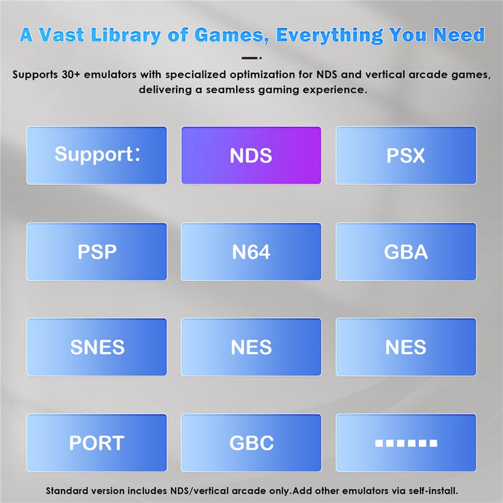 - 【Extensive Emulator Support】Pre-loaded with NDS and vertical arcade game collections, with the ability to install additional emulators for PSP, PSX, N64, GBA, SNES, NES, and many more classic systems.