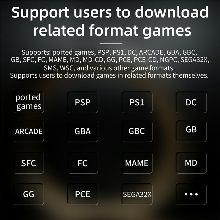 - 【Versatile Gaming Experience】Support for multiple game formats including PSP, PS1, DC, ARCADE, GBA, GBC, GB, SFC, FC, MAME, MD, MD-CD, GG, PCE, PCE-CD, NGPC, sega32x, SMS, and WSC, allowing users to download and play a wide variety of retro games