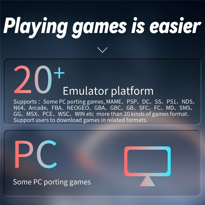 | Games | Support: Some PC porting games, MAMEDC, SS, PNDS, NEOGEO, SFC, FC, MD, SMS, GG, MSX, PCE, WSC, WIN, etc. more than 20 kinds of game formats. Support users to download games in related format |