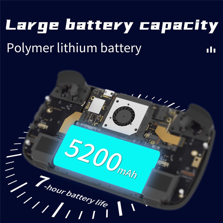 - The built-in 5200mAh battery offers up to 7 hours of continuous gaming on a single charge. Whether you're on a long journey or having an extended gaming session, this console ensures you have ample battery life to keep playing