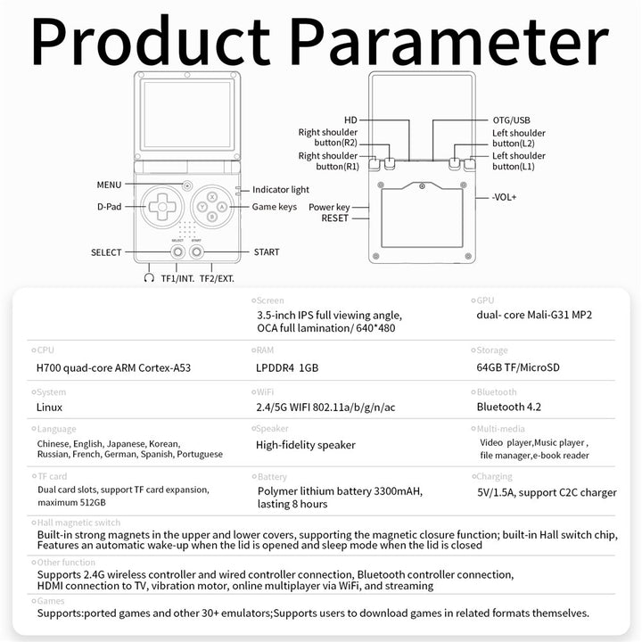 | Other Functions | Supports 2.4G wireless controller and wired controller connection, Bluetooth-compatible controller connection, HD connection to TV, vibration motor, online multiplayer via WiFi, and streaming |