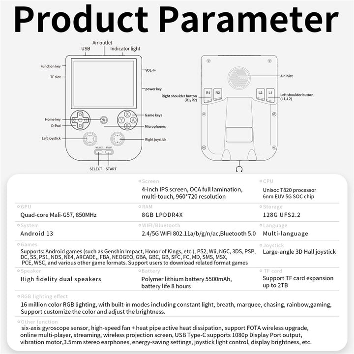 - Other functions: six-axis gyroscope sensor, high-speed fan + heat pipe active heat dissipation, support FOTA wireless upgrade, online multi-player, streaming, wireless projection screen, USB Type-C supports 1080p Display Port output, vibration motor, 3.5mm stereo earphones, energy-saving settings, joystick light control, display brightness, etc.
