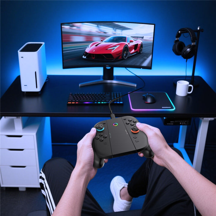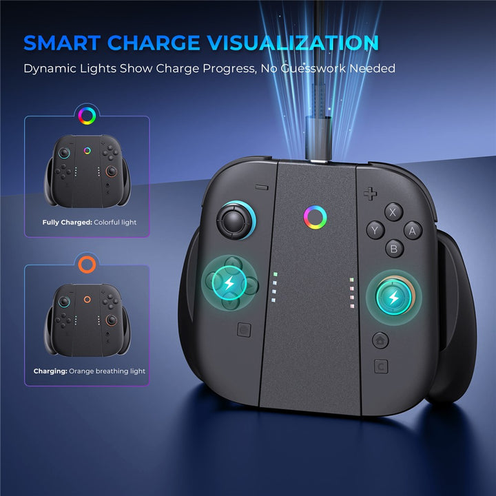 - 【Dual Charging Indicator】Central circular LED indicator displays charging status for both left and right Joy-Cons, with orange breathing light for charging, multicolor for full charge, and solid white for standby.