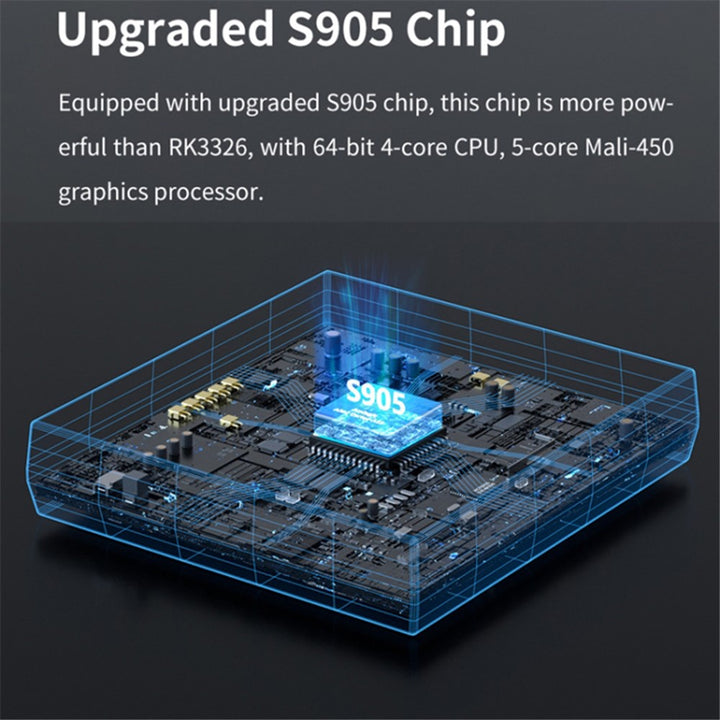 - Equipped with an upgraded S905 chip, which is more powerful than RK3326. It has a 4-core ARM Cortex-A53 CPU, and a 5-core Mali-450 graphics processor, and supports 4K@60fps video hard decoding and HDR processing