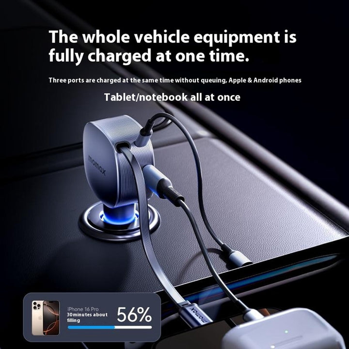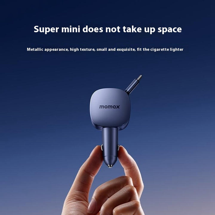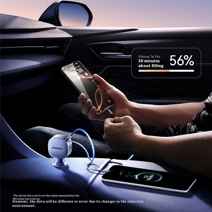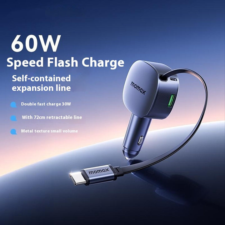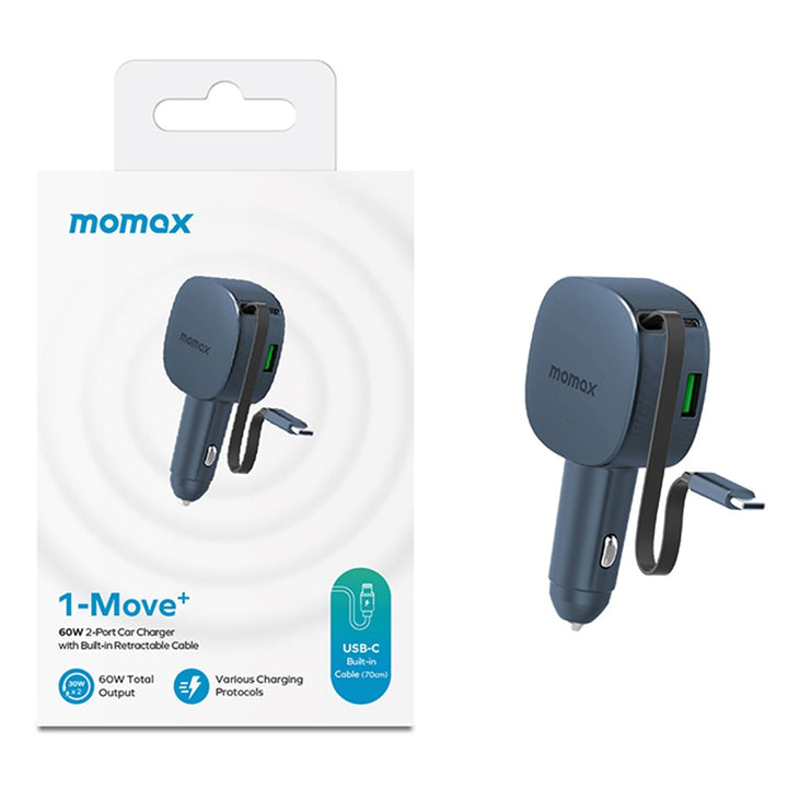 MOMAX 60W Car Charger USB-C + USB-A Fast Charging Adapter with Retractable USB-C Cable