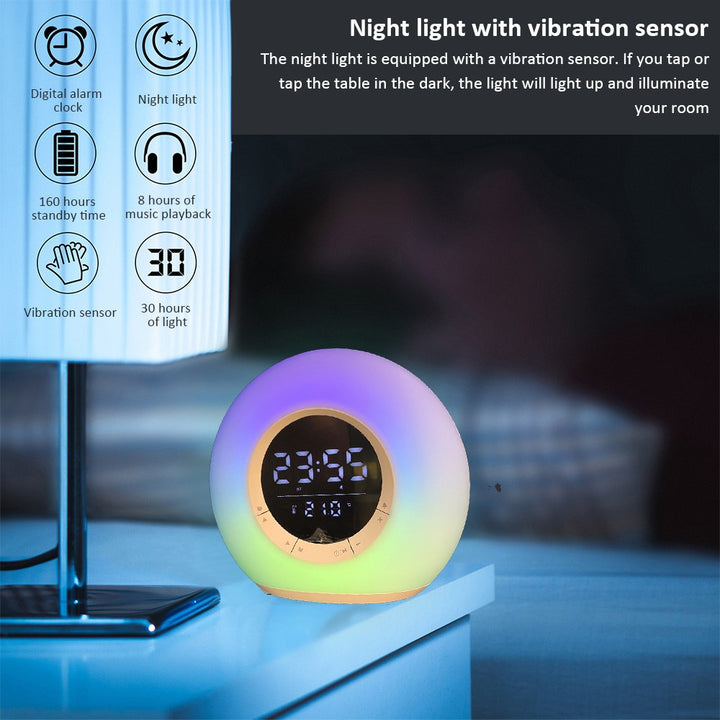 - All-in-one design, speaker + LED mood light + digital alarm clock + FM radio