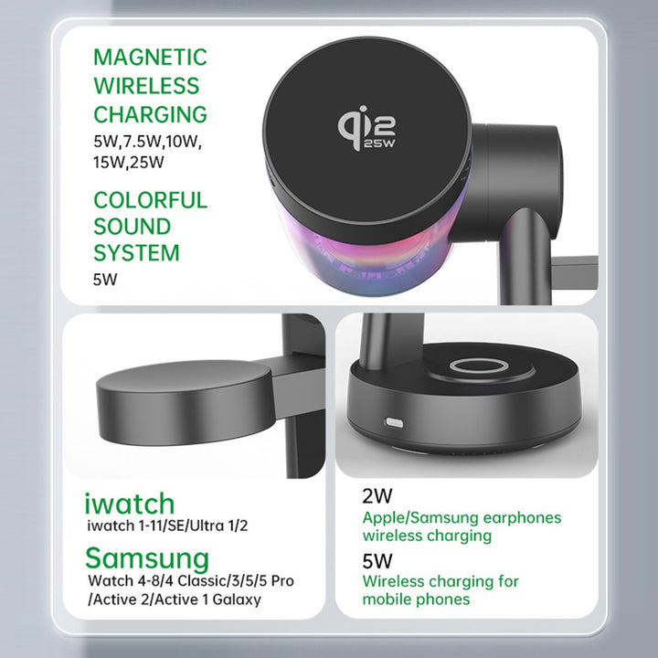 QI2.2 25W Magnetic Wireless Charger with Speaker Function for Phones / Earbuds / Watches Charging Station