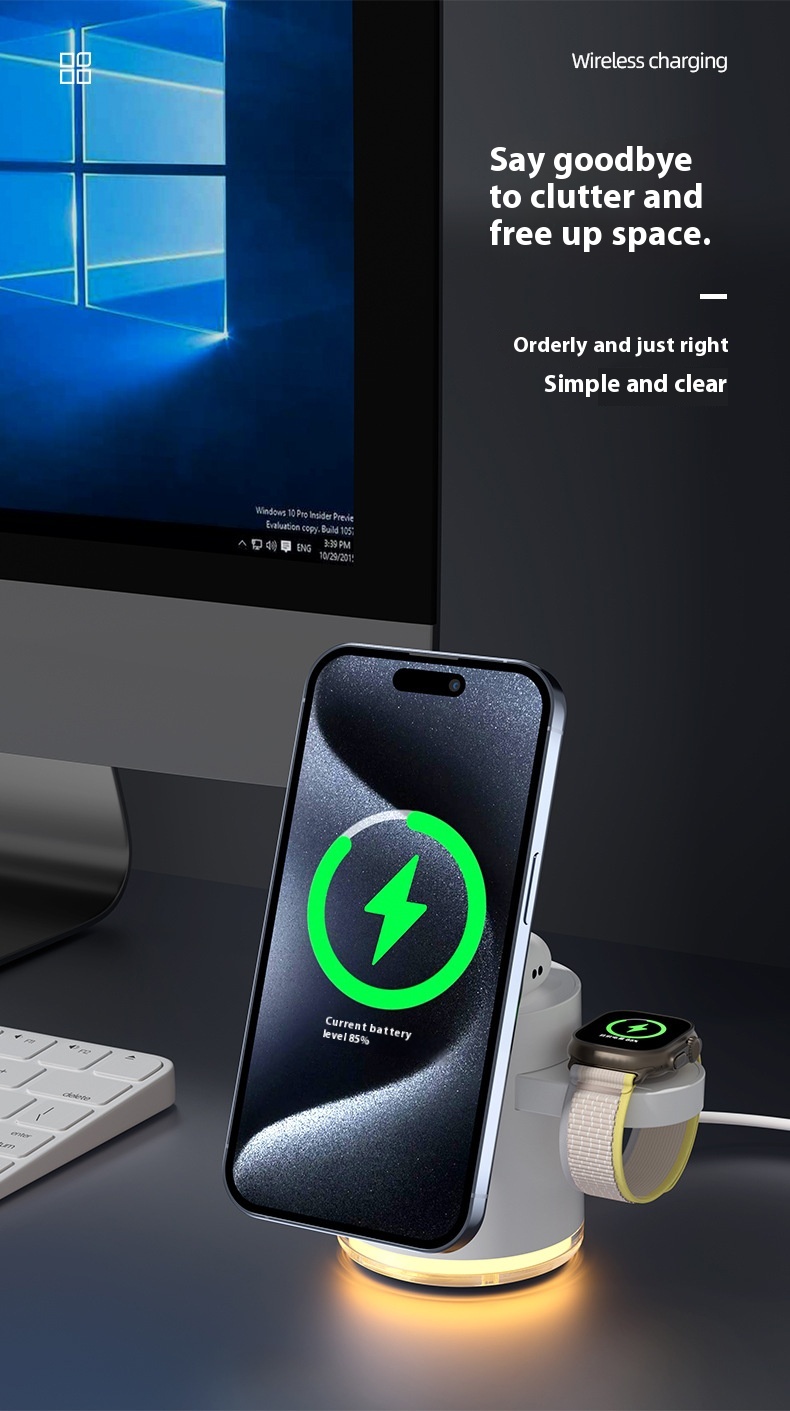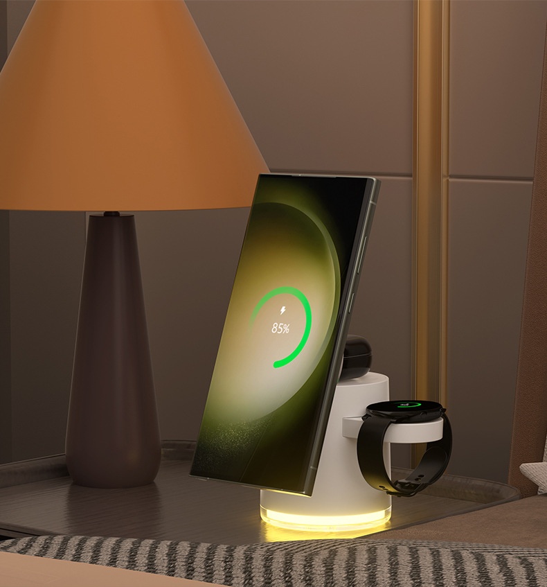 3‑in‑1 design (phone, watch, earbuds) | Eliminates cable clutter and consolidates charging |