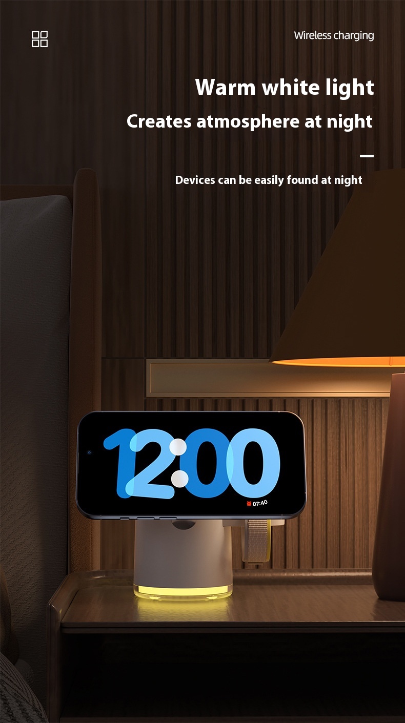 The base houses a warm white LED that softly glows during nighttime — helping you find your devices without needing bright overhead lights. The ambient light doubles as a gentle bedside glow, enhancing ease of use in dim settings.