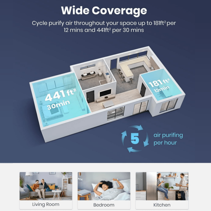 | Air Intake & Circulation | 360° air-intake tower design, full room coverage 182–441 sq ft (≈17–41 m²) in as little as 12 minutes :contentReference[oaicite:6]{index=6} |