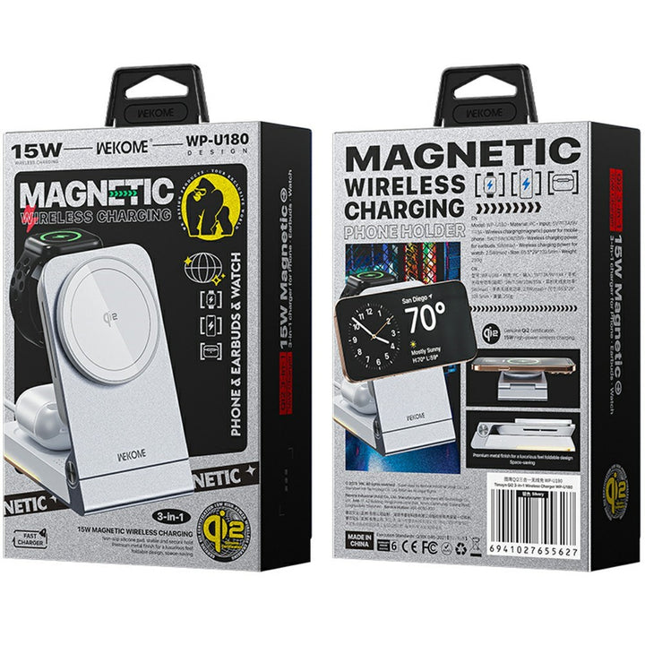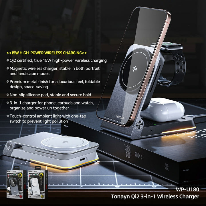 WEKOME WP-U180 Tonayn Qi2 3 in 1 Foldable Wireless Charger 15W Fast Charging for Phone Smartwatch Earbuds