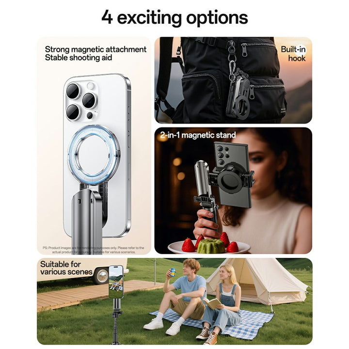 - 【Versatile Design】 2-in-1 BT mini selfie stick with magnetic attachment and clip for flexible use.