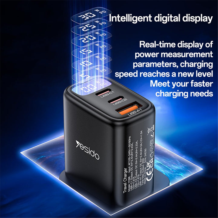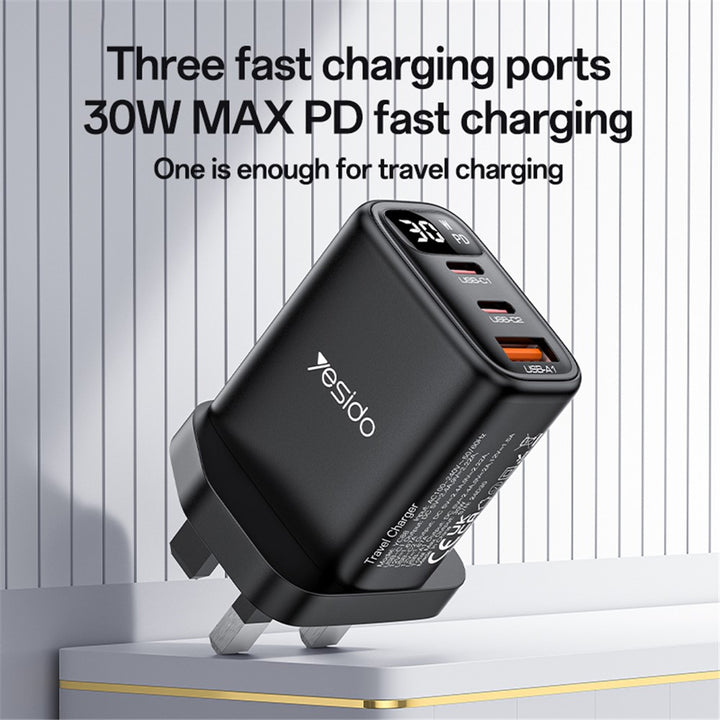 YESIDO YC88 Digital Display Wall Charger 2 Type-C + 1 USB-A 30W Phone Fast Charging Adapter, UK Plug