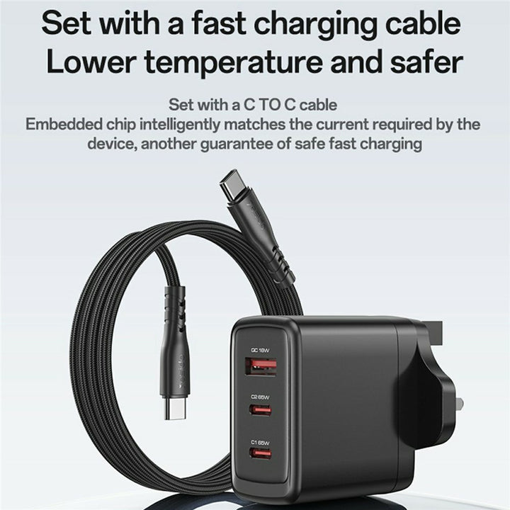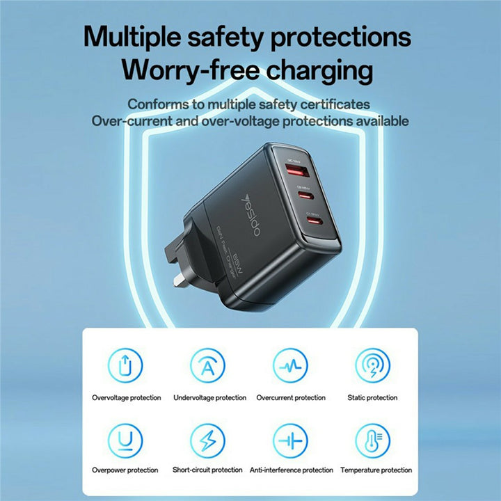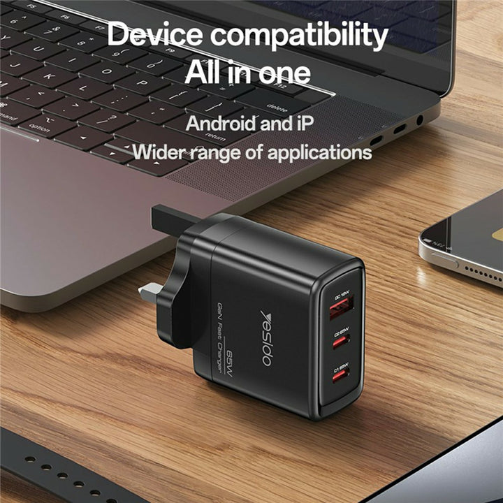 YESIDO YC98 UK Plug 65W High Power GaN Fast Charger 2 USB C + 1 USB A Portable Power Adapter