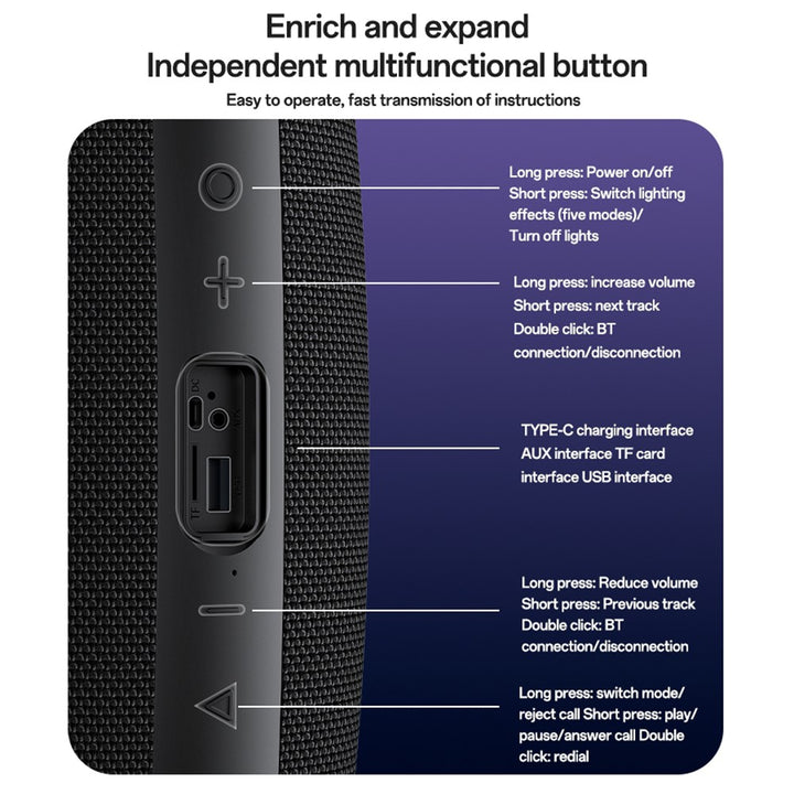- Supported Modes: TF/USB/TWS/AUX/BT/RGB/Hands-free Calling
